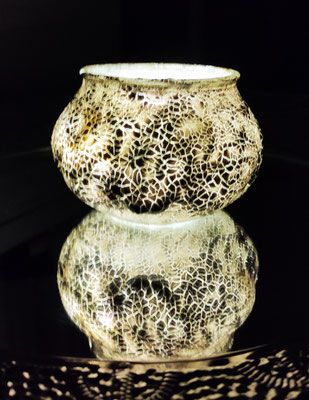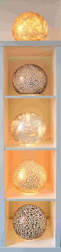 Wir gestalten Kugellampen-Kunstobjekte (25/12 cm Durchmesser), und andere facettenreiche Lichtobjekte, ob rund, elipsenförmig oder filigraner Miniatur. Die Objekte werden bearbeitet mit einer Antikpaste, in Gold, Silber oder Bronze.